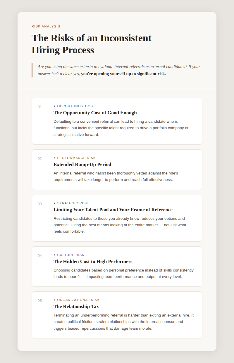 The biggest risk of internal referrals is the halo effect, where decision-makers favor a recommender’s reputation and/or relationship over objective qualifications, subtly lowering the bar without realizing it. The highest cost is missing the best hire entirely. When it comes to key strategic leadership, the distinction between being competent and exceptional is where value is created or lost.